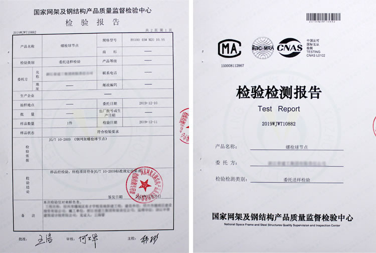 所用螺栓球節(jié)點(diǎn)均通過(guò)國(guó)家產(chǎn)品質(zhì)量檢驗(yàn)